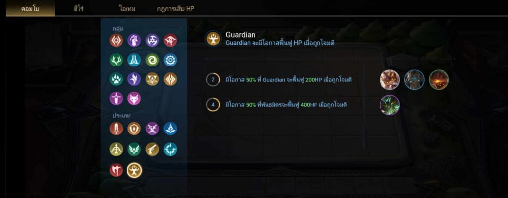 - Guardian จะมีโอกาศฟื้นฟู HP เมื่อถูกโจมตี มีผลเมื่อลง 2 และ 4 ตัว ฮีโร่ในกลุ่มนี้จะมี Gildur, Chaugnar, Grakk และ Baldum
